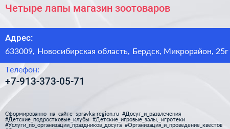 Четыре лапы, магазин зоотоваров по адресу 633009, Новосибирская область, Бердск, Микрорайон, 25г в дальнейшем Организация, размещена в следующих категориях: