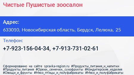 Чистые Пушистые, зоосалон по адресу 633010, Новосибирская область, Бердск, Лелюха, 25 в дальнейшем Организация, размещена в следующих категориях: