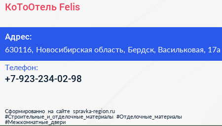 КоТоОтель Felis по адресу 630116, Новосибирская область, Бердск, Васильковая, 17а в дальнейшем Организация, размещена в следующих категориях: