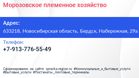 Морозовское племенное хозяйство по адресу 633218, Новосибирская область, Бердск, Набережная, 29а в дальнейшем Организация, размещена в следующих категориях: