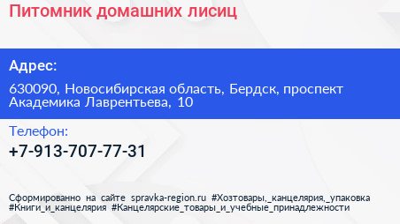 Питомник домашних лисиц по адресу 630090, Новосибирская область, Бердск, проспект Академика Лаврентьева, 10 в дальнейшем Организация, размещена в следующих категориях: