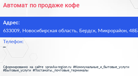Автомат по продаже кофе по адресу 633009, Новосибирская область, Бердск, Микрорайон, 48Б в дальнейшем Организация, размещена в следующих категориях: