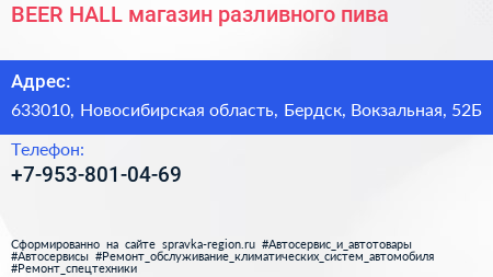 BEER HALL, магазин разливного пива по адресу 633010, Новосибирская область, Бердск, Вокзальная, 52Б в дальнейшем Организация, размещена в следующих категориях: