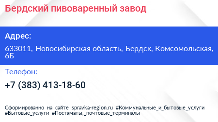 Бердский пивоваренный завод по адресу 633011, Новосибирская область, Бердск, Комсомольская, 6Б в дальнейшем Организация, размещена в следующих категориях: