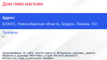 Дом пива, магазин по адресу 633011, Новосибирская область, Бердск, Ленина, 15г в дальнейшем Организация, размещена в следующих категориях: