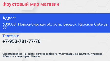Фруктовый мир, магазин по адресу 633003, Новосибирская область, Бердск, Красная Сибирь, 97 в дальнейшем Организация, размещена в следующих категориях:
