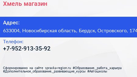 Хмель, магазин по адресу 633004, Новосибирская область, Бердск, Островского, 174 в дальнейшем Организация, размещена в следующих категориях: