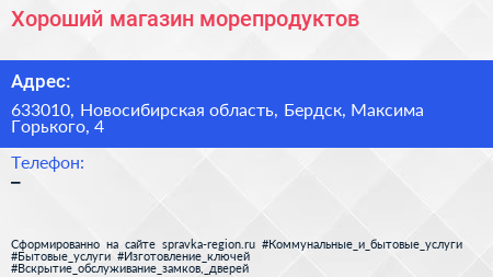 Хороший, магазин морепродуктов по адресу 633010, Новосибирская область, Бердск, Максима Горького, 4 в дальнейшем Организация, размещена в следующих категориях: