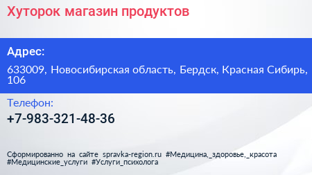 Хуторок, магазин продуктов по адресу 633009, Новосибирская область, Бердск, Красная Сибирь, 106 в дальнейшем Организация, размещена в следующих категориях: