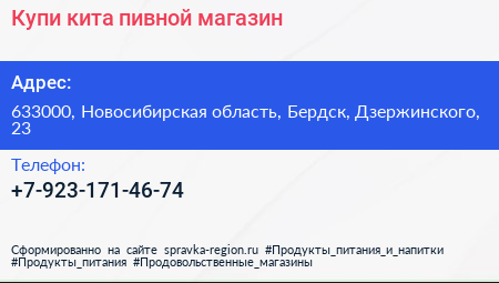 Купи кита, пивной магазин по адресу 633000, Новосибирская область, Бердск, Дзержинского, 23 в дальнейшем Организация, размещена в следующих категориях: