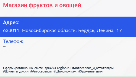 Магазин фруктов и овощей по адресу 633011, Новосибирская область, Бердск, Ленина, 17 в дальнейшем Организация, размещена в следующих категориях: