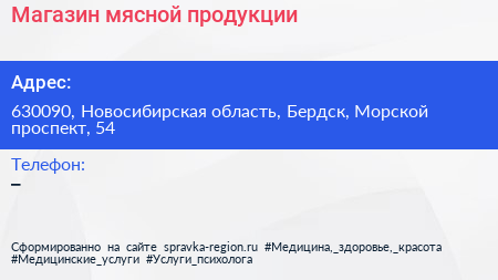 Магазин мясной продукции по адресу 630090, Новосибирская область, Бердск, Морской проспект, 54 в дальнейшем Организация, размещена в следующих категориях: