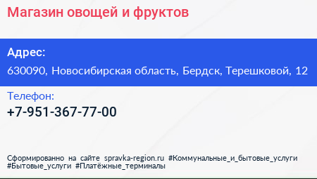 Магазин овощей и фруктов по адресу 630090, Новосибирская область, Бердск, Терешковой, 12 в дальнейшем Организация, размещена в следующих категориях: