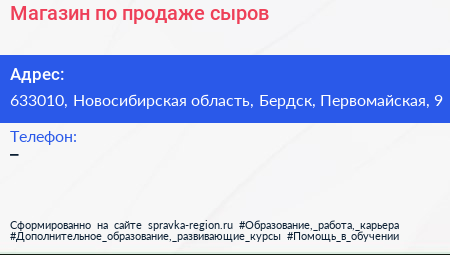Магазин по продаже сыров по адресу 633010, Новосибирская область, Бердск, Первомайская, 9 в дальнейшем Организация, размещена в следующих категориях:
