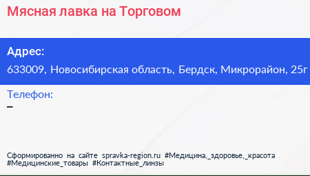 Мясная лавка на Торговом по адресу 633009, Новосибирская область, Бердск, Микрорайон, 25г в дальнейшем Организация, размещена в следующих категориях: