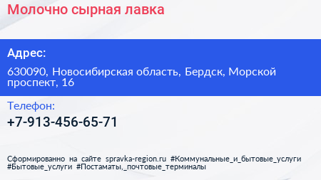Молочно-сырная лавка по адресу 630090, Новосибирская область, Бердск, Морской проспект, 16 в дальнейшем Организация, размещена в следующих категориях: