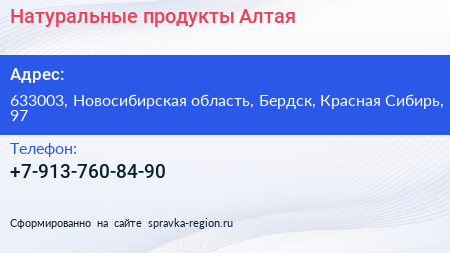 Натуральные продукты Алтая по адресу 633003, Новосибирская область, Бердск, Красная Сибирь, 97 в дальнейшем Организация, размещена в следующих категориях: