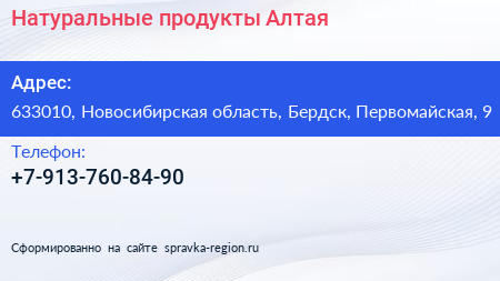 Натуральные продукты Алтая по адресу 633010, Новосибирская область, Бердск, Первомайская, 9 в дальнейшем Организация, размещена в следующих категориях: