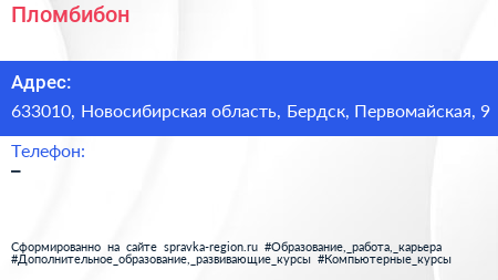 Пломбибон по адресу 633010, Новосибирская область, Бердск, Первомайская, 9 в дальнейшем Организация, размещена в следующих категориях: