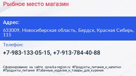 Рыбное место, магазин по адресу 633009, Новосибирская область, Бердск, Красная Сибирь, 115 в дальнейшем Организация, размещена в следующих категориях: