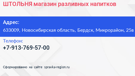 ШТОЛЬНЯ, магазин разливных напитков по адресу 633009, Новосибирская область, Бердск, Микрорайон, 25в в дальнейшем Организация, размещена в следующих категориях: