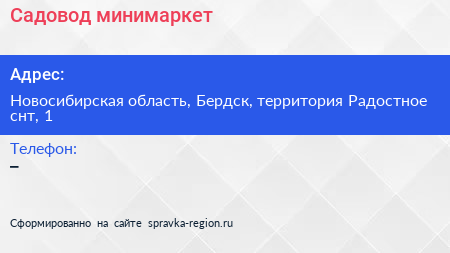 Садовод, минимаркет по адресу Новосибирская область, Бердск, территория Радостное снт, 1 в дальнейшем Организация, размещена в следующих категориях: