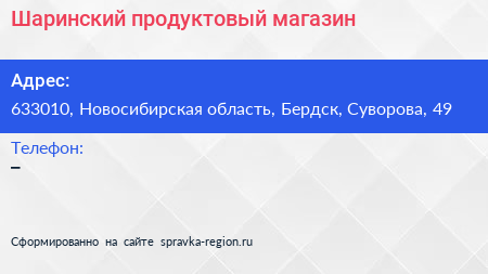 Шаринский, продуктовый магазин по адресу 633010, Новосибирская область, Бердск, Суворова, 49 в дальнейшем Организация, размещена в следующих категориях: