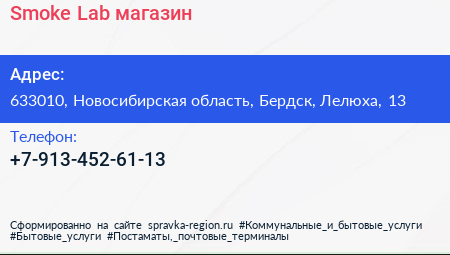 Smoke Lab, магазин по адресу 633010, Новосибирская область, Бердск, Лелюха, 13 в дальнейшем Организация, размещена в следующих категориях: