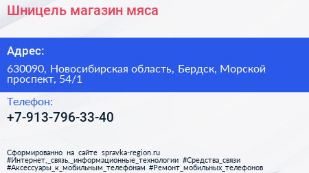 Шницель, магазин мяса по адресу 630090, Новосибирская область, Бердск, Морской проспект, 54/1 в дальнейшем Организация, размещена в следующих категориях: