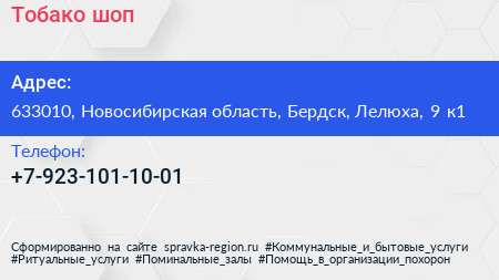 Тобако шоп по адресу 633010, Новосибирская область, Бердск, Лелюха, 9 к1 в дальнейшем Организация, размещена в следующих категориях: