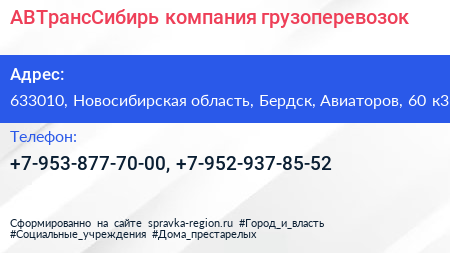 АВТрансСибирь, компания грузоперевозок по адресу 633010, Новосибирская область, Бердск, Авиаторов, 60 к3 в дальнейшем Организация, размещена в следующих категориях: