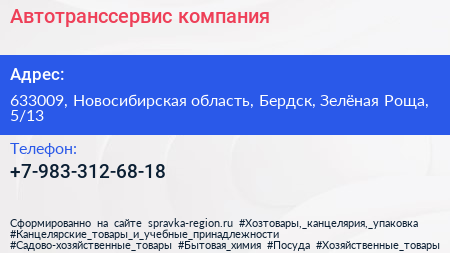 Автотранссервис, компания по адресу 633009, Новосибирская область, Бердск, Зелёная Роща, 5/13 в дальнейшем Организация, размещена в следующих категориях:
