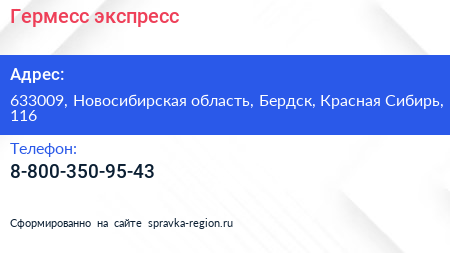 Гермесс экспресс по адресу 633009, Новосибирская область, Бердск, Красная Сибирь, 116 в дальнейшем Организация, размещена в следующих категориях: