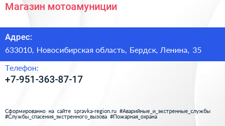 Магазин мотоамуниции по адресу 633010, Новосибирская область, Бердск, Ленина, 35 в дальнейшем Организация, размещена в следующих категориях:
