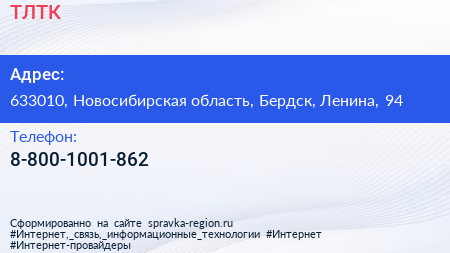 ТЛТК по адресу 633010, Новосибирская область, Бердск, Ленина, 94 в дальнейшем Организация, размещена в следующих категориях: