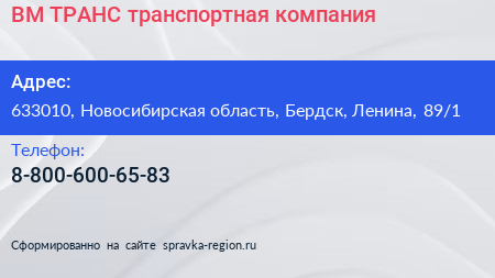 ВМ ТРАНС, транспортная компания по адресу 633010, Новосибирская область, Бердск, Ленина, 89/1 в дальнейшем Организация, размещена в следующих категориях: