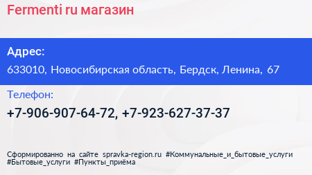 Fermenti.ru, магазин по адресу 633010, Новосибирская область, Бердск, Ленина, 67 в дальнейшем Организация, размещена в следующих категориях:
