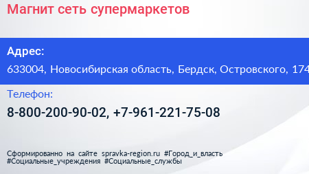 Магнит, сеть супермаркетов по адресу 633004, Новосибирская область, Бердск, Островского, 174 в дальнейшем Организация, размещена в следующих категориях: