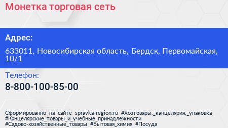 Монетка, торговая сеть по адресу 633011, Новосибирская область, Бердск, Первомайская, 10/1 в дальнейшем Организация, размещена в следующих категориях:
