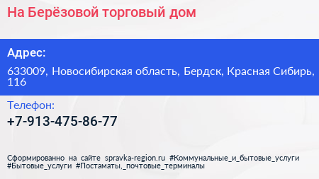 На Берёзовой, торговый дом по адресу 633009, Новосибирская область, Бердск, Красная Сибирь, 116 в дальнейшем Организация, размещена в следующих категориях:
