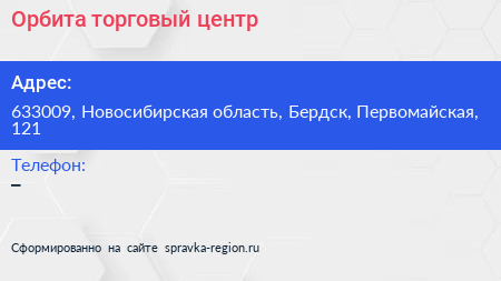 Орбита, торговый центр по адресу 633009, Новосибирская область, Бердск, Первомайская, 121 в дальнейшем Организация, размещена в следующих категориях: