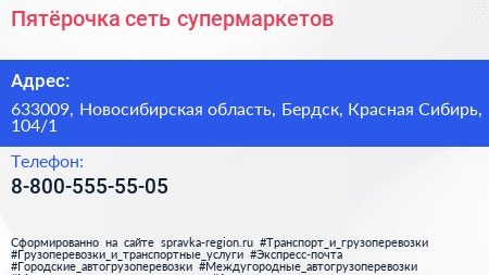 Пятёрочка, сеть супермаркетов по адресу 633009, Новосибирская область, Бердск, Красная Сибирь, 104/1 в дальнейшем Организация, размещена в следующих категориях: