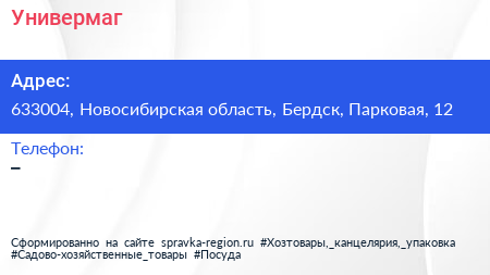 Универмаг по адресу 633004, Новосибирская область, Бердск, Парковая, 12 в дальнейшем Организация, размещена в следующих категориях: