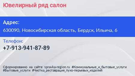 Ювелирный ряд, салон по адресу 630090, Новосибирская область, Бердск, Ильича, 6 в дальнейшем Организация, размещена в следующих категориях: