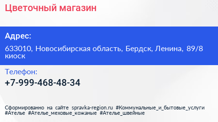 Цветочный магазин по адресу 633010, Новосибирская область, Бердск, Ленина, 89/8 киоск в дальнейшем Организация, размещена в следующих категориях: