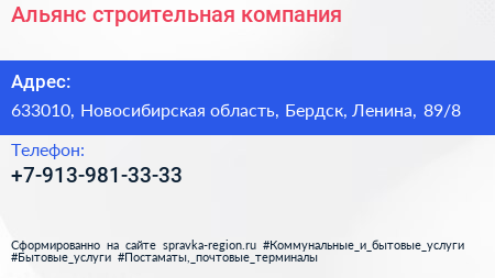 Альянс, строительная компания по адресу 633010, Новосибирская область, Бердск, Ленина, 89/8 в дальнейшем Организация, размещена в следующих категориях: