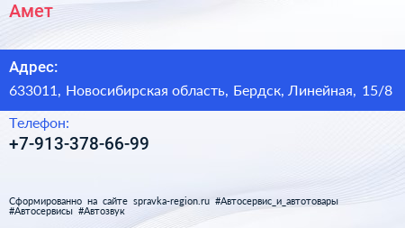 Амет по адресу 633011, Новосибирская область, Бердск, Линейная, 15/8 в дальнейшем Организация, размещена в следующих категориях: