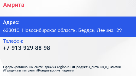 Амрита по адресу 633010, Новосибирская область, Бердск, Ленина, 29 в дальнейшем Организация, размещена в следующих категориях: