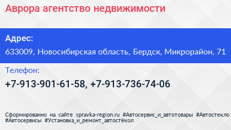 Аврора, агентство недвижимости по адресу 633009, Новосибирская область, Бердск, Микрорайон, 71 в дальнейшем Организация, размещена в следующих категориях:
