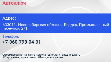 Автоключ по адресу 633011, Новосибирская область, Бердск, Промышленный переулок, 2/1 в дальнейшем Организация, размещена в следующих категориях: